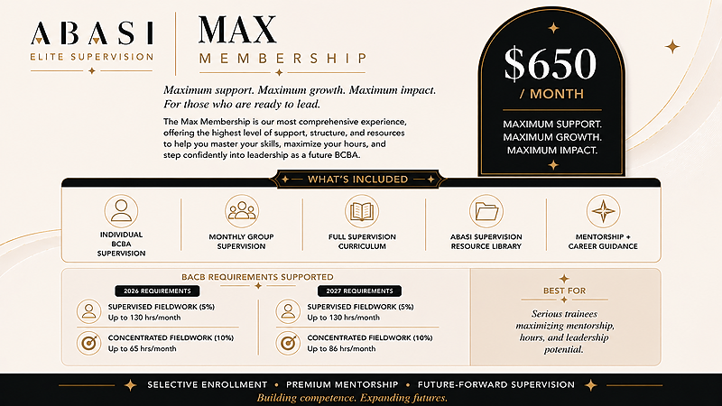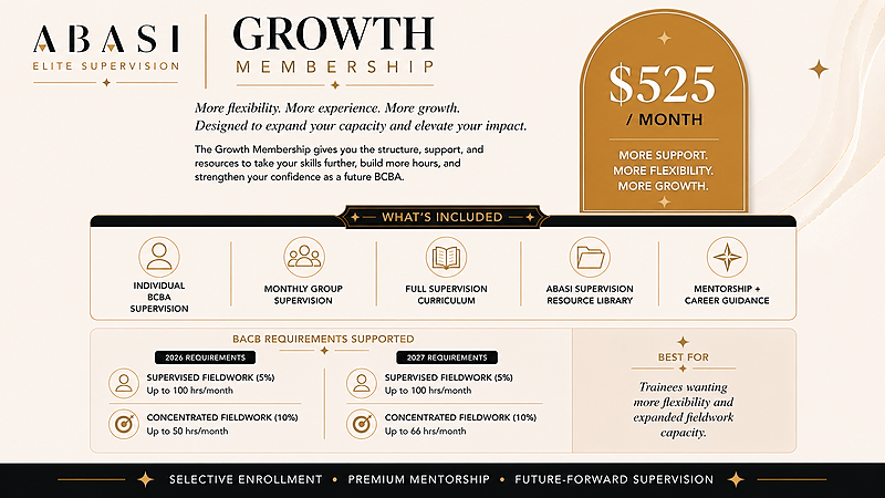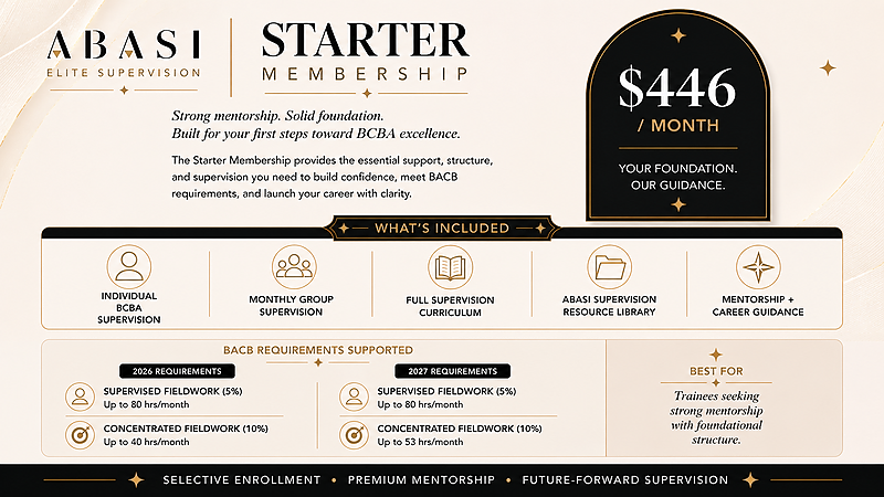 BundleStarter Package Membership for BCBA trainees: includes individual supervision, monthly group supervision, full ABASI curriculum, resource library, and mentorship. Flexible month-to-month with structured support to build competence and confidence.